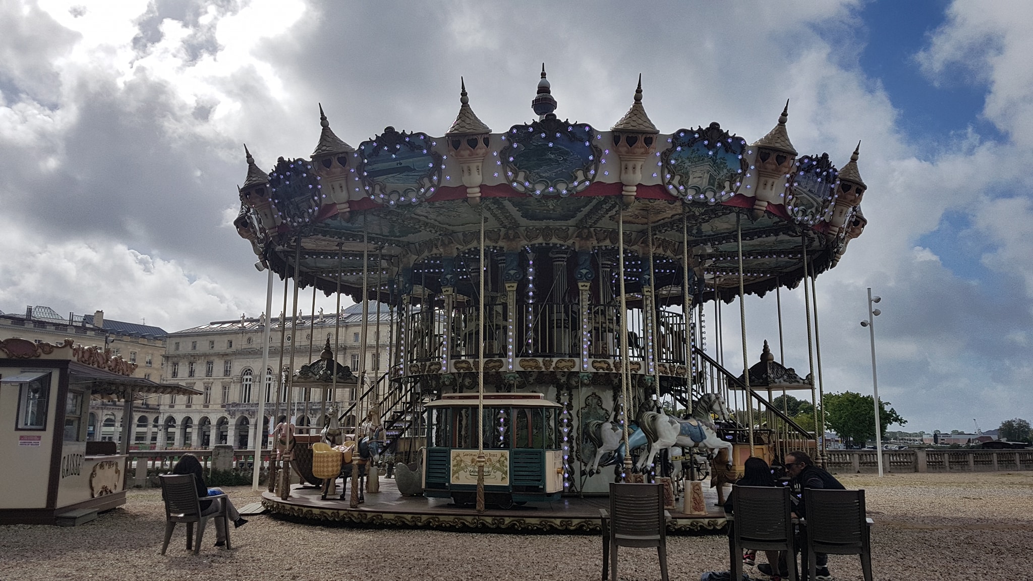 慢慢走回車站,河岸這邊有座我這輩子看過最大又漂亮的旋轉木馬,而且仍在運轉著。選了一個長椅坐下,靜靜看著旋轉木馬,坐在上面看起來好開心的小朋友們嘻嘻哈哈,不時他們回頭看看也坐在後面木馬上的父母,陽光下裡瀰漫著幸福氛圍。