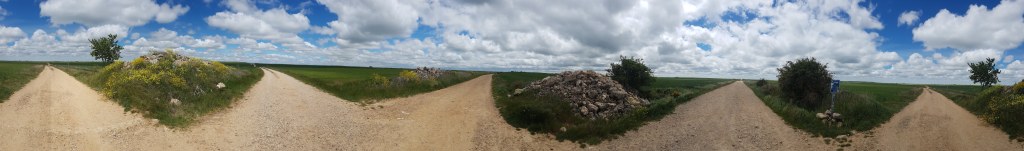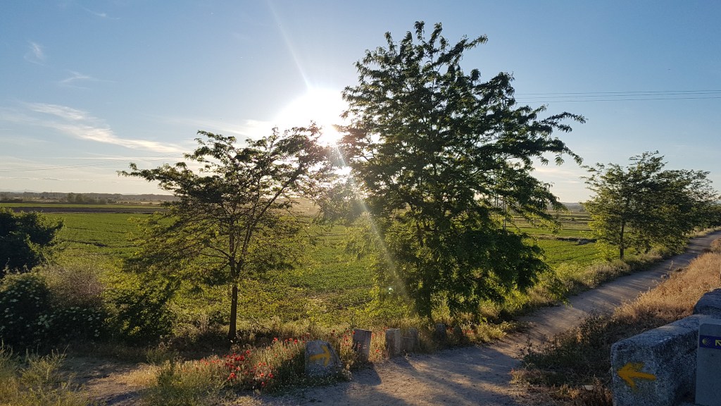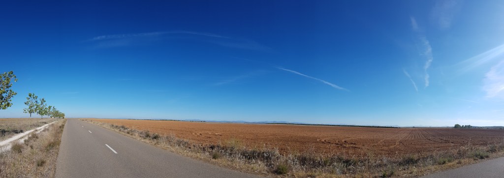 之前在前往Belorado,沿途好幾公里都是一樣的景色,這幾天行經梅塞塔高原Meseta Central(從Burgos後的地形),除了一路無遮蔽無涼爽陰影,地貌在走了n公里後,居然還是長得一樣(大白天的鬼打牆版本),會一直有一種史瑞克要去[遠的要命的王國]的感覺。